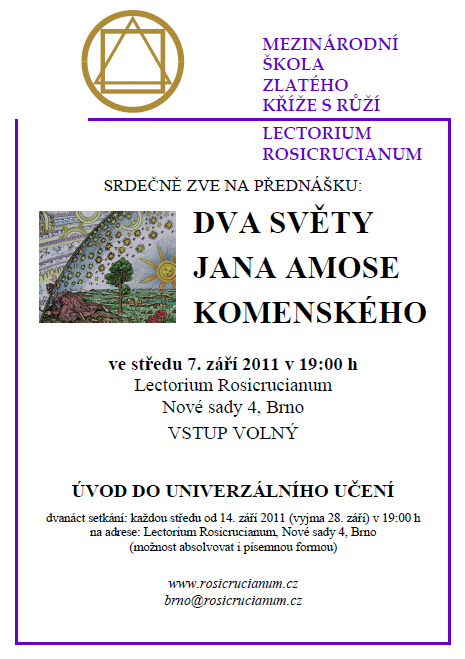 Nacházel Komenský ve své době spřízněné duše? Jaký vztah měl ke klasickým Rosikruciánům? Jaká poselství jsou ukrytá v jeho díle? Například těmito otázkami se chceme zabývat na přednášce Dva světy Jana Amose Komenského, která se koná ve středu 7. září v 19:00 hodin v nádvorním objektu domu na ulici Nové sady 4 v Brně. Na tuto přednášku Vás srdečně zveme.