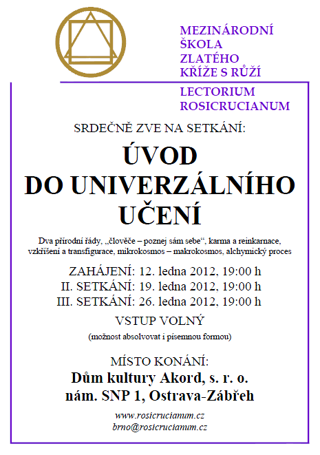 Srdečně zveme všechny zájemce na setkání ÚVOD DO UNIVERZÁLNÍHO UČENÍ, kde se mohou formou rozhovorů seznámit s cestou a cílem, o který usiluje škola Zlatého Kříže s Růží a který byl hledajícímu člověku ukazován odnepaměti. Některé z témat těchto setkání jsou: dva přírodní řády, „člověče – poznej sám sebe“, karma a reinkarnace, vzkříšení a transfigurace, mikrokosmos – makrokosmos, alchymický proces. Setkání budou probíhat ve čtvrtky od 12. ledna 2012 od 19 hodin v Domě kultury Akord na náměstí SNP 1 v Ostravě.