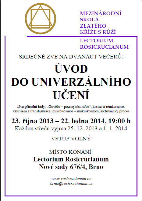 Srdečně zveme všechny zájemce, kteří se chtějí blíže seznámit s filosofíí Mezinárodní školy Zlatého Kříže s Růží, Lectorium Rosicrucianum, s moderní filosofíí, jejíž podstata provází lidstvo již odnepaměti. Neměnná podstata zůstává stejná, v čase se mění pouze vnější roucho, které na sebe pravda v tomto světě bere. Je to tedy filosofie nová a přesto velmi stará. V cyklu 12 setkání ÚVOD DO UNIVERZÁLNÍHO UČENÍ dostane účastník možnost rozlišit tyto již naznačené dvě skutečnosti, dva přírodní řády, pomíjivé a nepomíjivé, vnější a vnitřní, což mu může pomoci vysvětlit mnohé, co již možná podvědomě dlouho tuší. Rozlišení dvou přírodních řádů je pevnou základnou k uskutečnění cíle, před který je lidstvo svým původem postaveno. Setkání budou probíhat v centru školy na Nových sadech 676/4 v Brně, každou středu od 23. října 2013 do 22. ledna 2014 (vyjma 25. prosince 2013 a 1. ledna 2014) ve stejnou dobu, v 19 hodin.