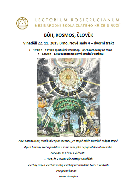 Zveme Vás na spirituální workshop na téma BŮH, KOSMOS, ČLOVĚK, v neděli 22. listopadu 2015, od 10:00 hodin v brněnském centru Lectoria Rosicrucianum na Nových sadech 4. Od 12:00 hodin bude workshop završen kontemplativním setkáním v chrámu.