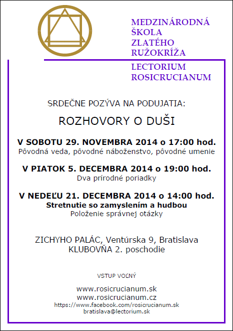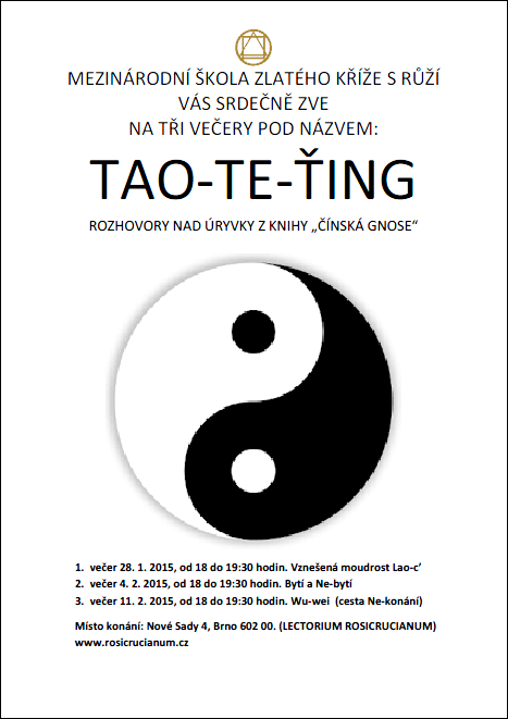 Srdečně Vás zveme na cyklus tří večerů s názvem TAO-TE-ŤING. Tyto večery budou probíhat ve formě rozhovorů nad úryvky z knihy „Čínská Gnose“, v brněnském centru školy Lectorium Rosicrucianum na Nových sadech 4 v Brně.