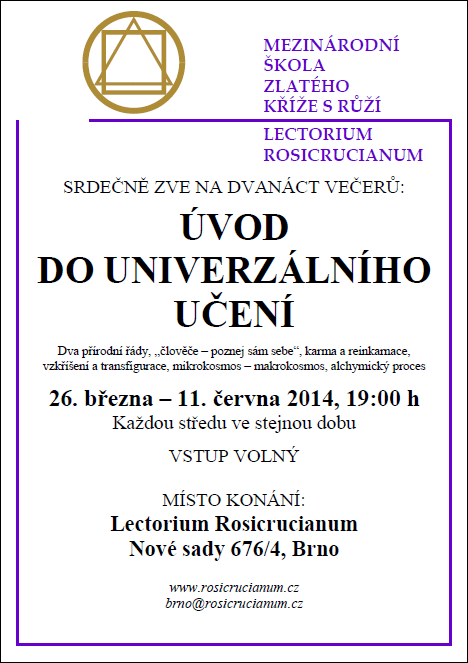 Srdečně zveme všechny zájemce, kteří se chtějí blíže seznámit s filosofíí Mezinárodní školy Zlatého Kříže s Růží, Lectorium Rosicrucianum, s moderní filosofíí, jejíž podstata provází lidstvo již odnepaměti. Neměnná podstata zůstává stejná, v čase se mění pouze vnější roucho, které na sebe pravda v tomto světě bere. Je to tedy filosofie nová a přesto velmi stará. V cyklu 12 setkání ÚVOD DO UNIVERZÁLNÍHO UČENÍ dostane účastník možnost rozlišit tyto již naznačené dvě skutečnosti, dva přírodní řády, pomíjivé a nepomíjivé, vnější a vnitřní, což mu může pomoci vysvětlit mnohé, co již možná podvědomě dlouho tuší. Rozlišení dvou přírodních řádů je pevnou základnou k uskutečnění cíle, před který je lidstvo svým původem postaveno. Setkání budou probíhat v centru školy na Nových sadech 676/4 v Brně, každou středu od 26. března do 11. června 2014 ve stejnou dobu, v 19 hodin.