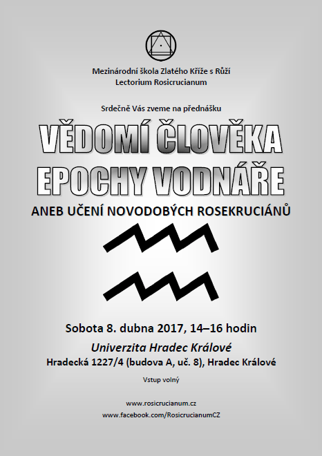Srdečně Vás zveme na přednášku VĚDOMÍ ČLOVĚKA EPOCHY VODNÁŘE ANEB UČENÍ NOVODOBÝCH ROSEKRUCIÁNŮ, která se uskuteční v sobotu 8. dubna 2017, v čase 14–16 hodin na adrese Univerzita Hradec Králové, Hradecká 1227/4 (budova A, uč. 8), Hradec Králové.